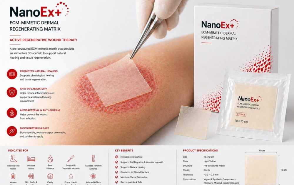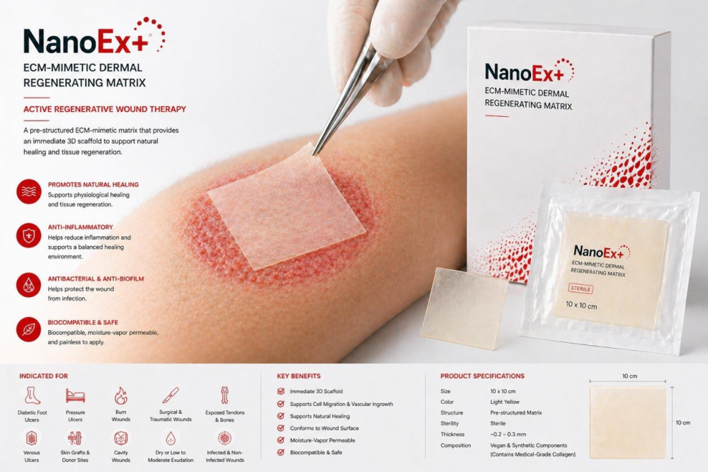 Its advanced bioactive composition, structural integrity, and scaffold functionality position NanoEx+ as a next-generation solution in regenerative wound therapy.