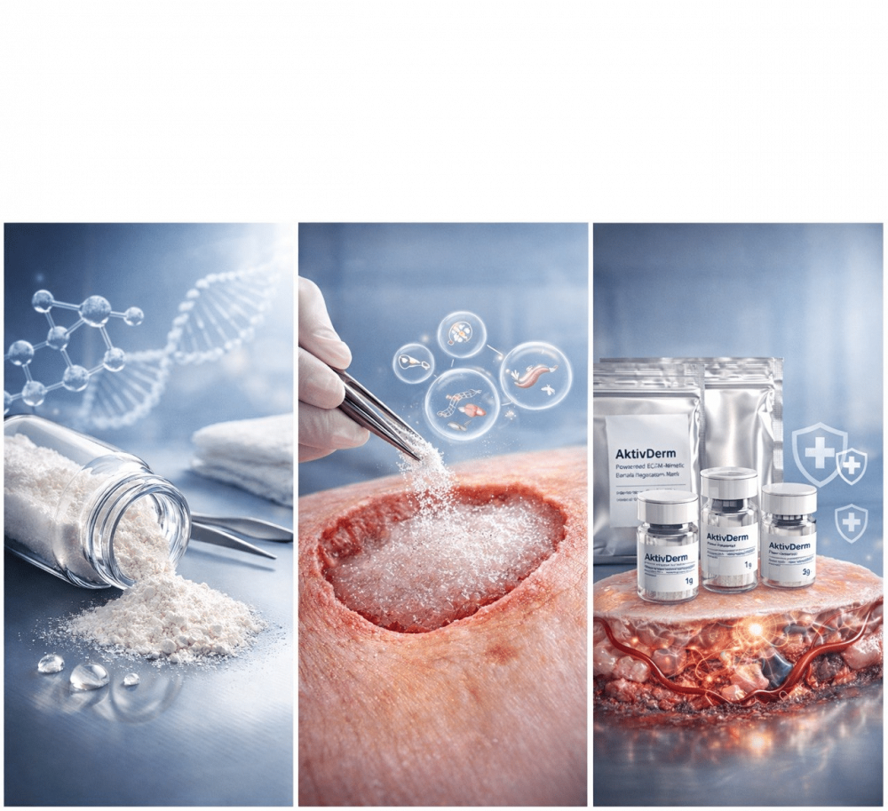 By transforming from a sterile micronized powder into a structured three-dimensional ECM mimetic dermal matrix upon hydration, AktivDerm Powdered ECM-mimetic Dermal Regenerating Matrix creates a controlled and optimized wound microenvironment designed to support physiological healing and tissue repair.