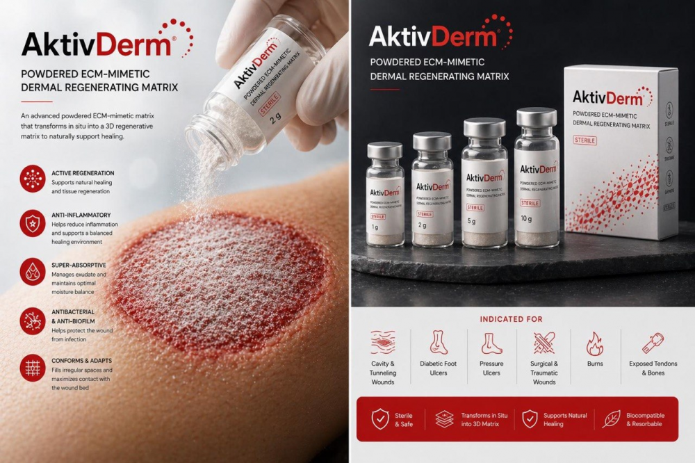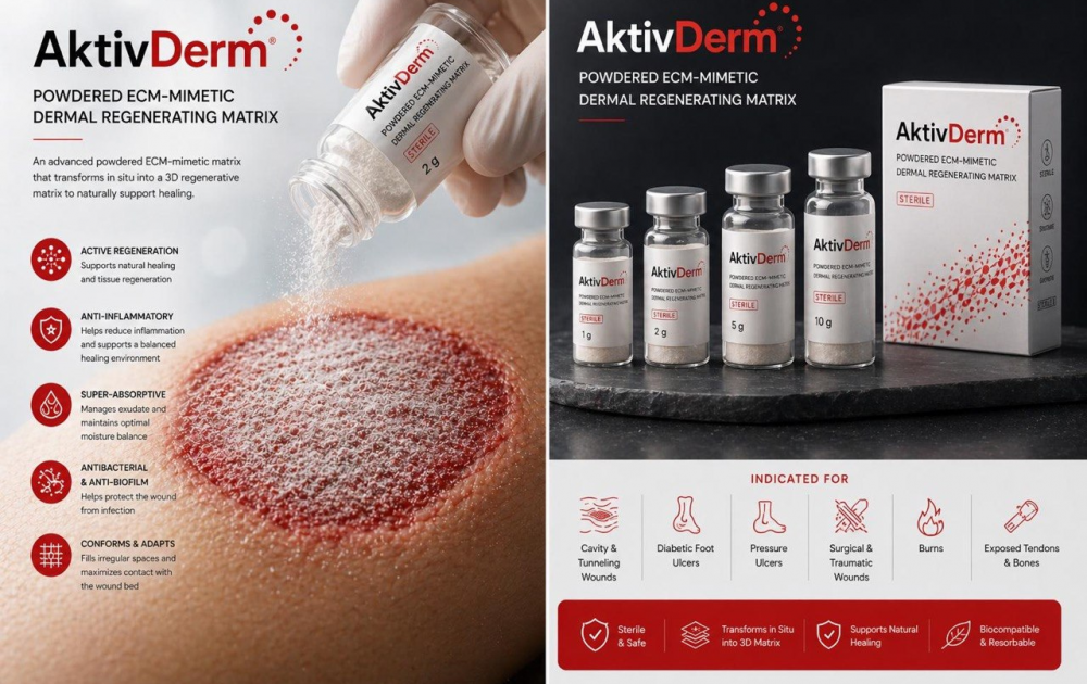Unlike passive absorbent dressings that serve primarily as coverage, AktivDerm Powdered ECM-mimetic Dermal Regenerating Matrix forms an in situ regenerative scaffold that actively participates in the wound healing environment. Its conformability and scaffold- forming properties allow uniform distribution throughout complex wound geometries, including undermined and irregular spaces.